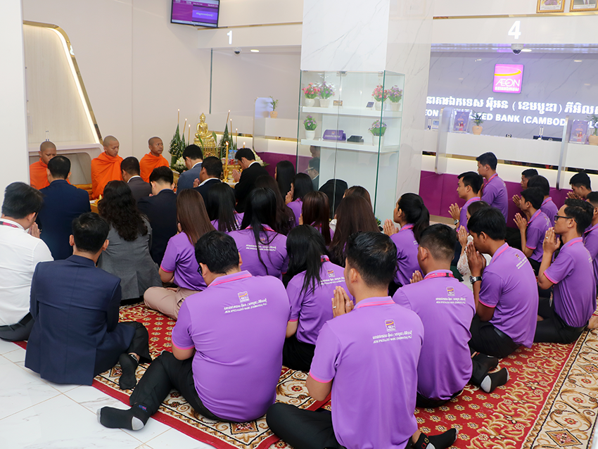AEON Specialized Bank (Cambodia) Plc. has organized a branch blessing ceremony to officially launch a new branch in Krong Stueng Saen, Kampong Thom Province with the honor of Managing Director, Mr. Junji Noda, Executive Director, Mr. Shuji Taniguchi, and Head of Retail Banking Department, Mr. Kong Kosal to cut the ribbon for this launching event.