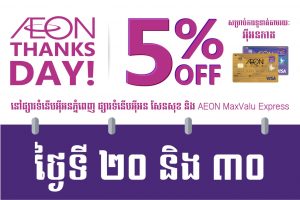 ថ្ងៃថ្លែងអំណរគុណ (AEON Thanks day) គឺជាការថ្លែងអំណរគុណចំពោះម្ចាស់អ៉ីអនកាតទាំងអស់ ដោយម្ចាស់អ៉ីអនកាតទាំងអស់ នឹងទទួលបានការបញ្ចុះតម្លៃ ៥% ភ្លាមៗដោយគ្រាន់តែធ្វើការទូទាត់វិក្កយបត្រតាមរយៈអ៉ីអនកាត នៅផ្សារទំនើបអ៉ីអន (ខេមបូឌា) (ខាងក្នុងផ្សារទំនើបអ៉ីអនម៉ល ភ្នំពេញ ផ្សារទំនើបអ៉ីអនម៉ល សែនសុខ ស៊ីធី និងផ្សារទំនើបអ៉ីអនម៉ល មានជ័យ) និង AEON MaxValu Express គ្រប់សាខា នៅរៀងរាល់ថ្ងៃទី ២០ និងថ្ងៃទី ៣០ នៃខែនីមួយៗ។